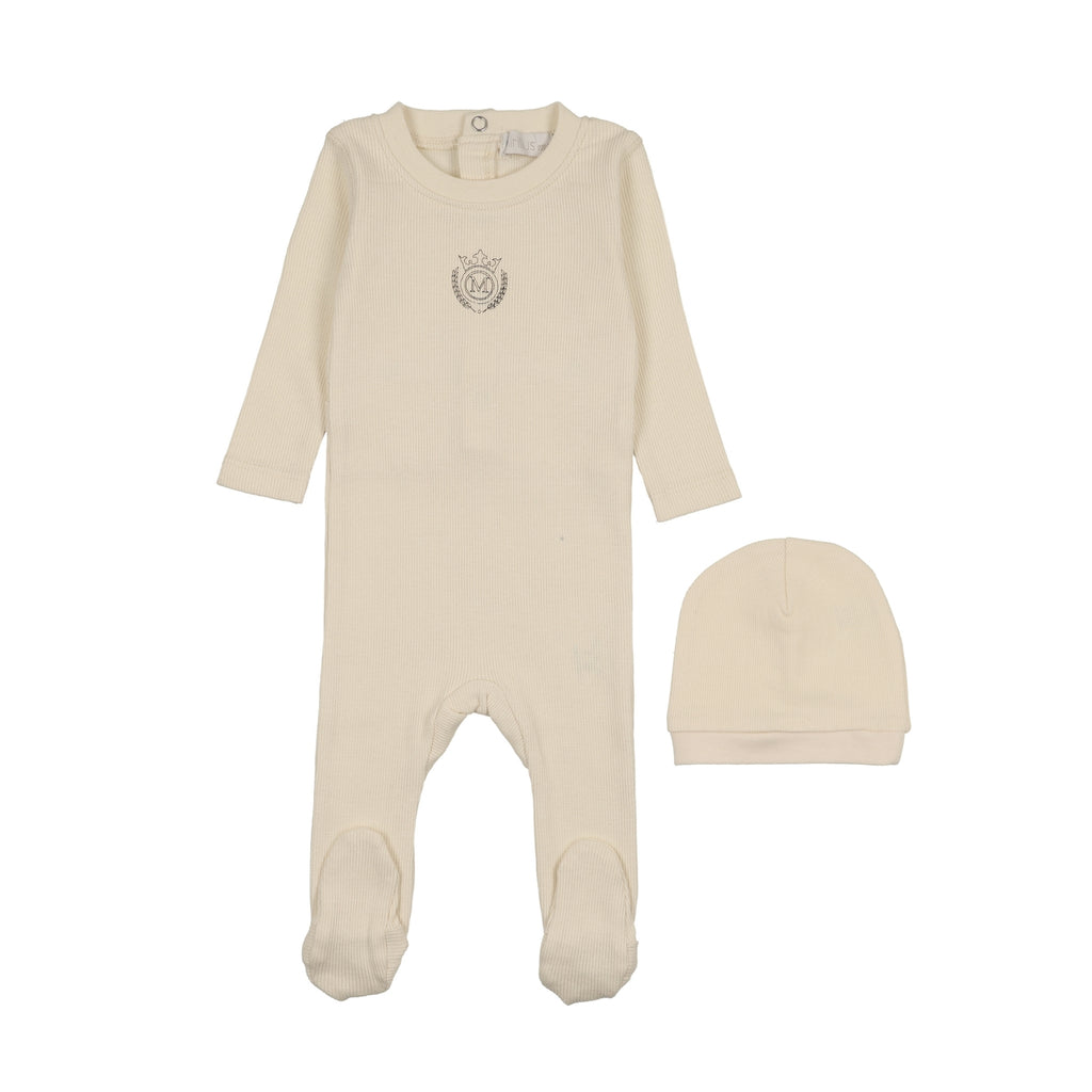 Wrap your little one in cozy charm with our Ivory Ribbed Footie with Emblem, crafted from soft ribbed fabric for gentle comfort. Featuring a centered emblem for a signature touch, this footie combines warmth and style in one adorable piece. Perfect for pairing with other pieces from this collection, sold separately, for a coordinated look.