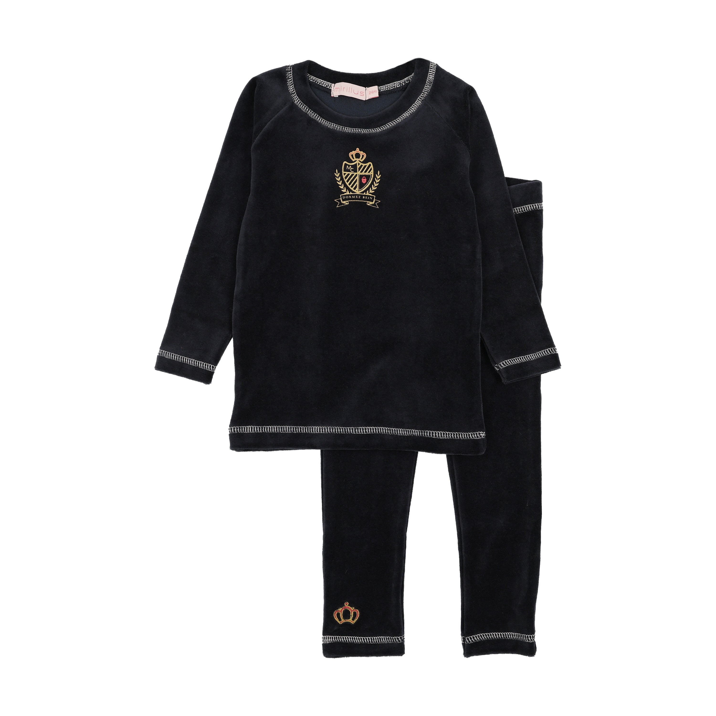 Crafted from soft stretched velour fabric, our Indigo Mist Velour Lounge Pajama with Crest Embroidery blends comfort with refined detail. A gold embroidered crest on the chest and a smaller crest patch on the foot highlight its signature look, while flatlock stitching ensures durability with a smooth finish. A cozy yet distinctive pajama for stylish lounging.
