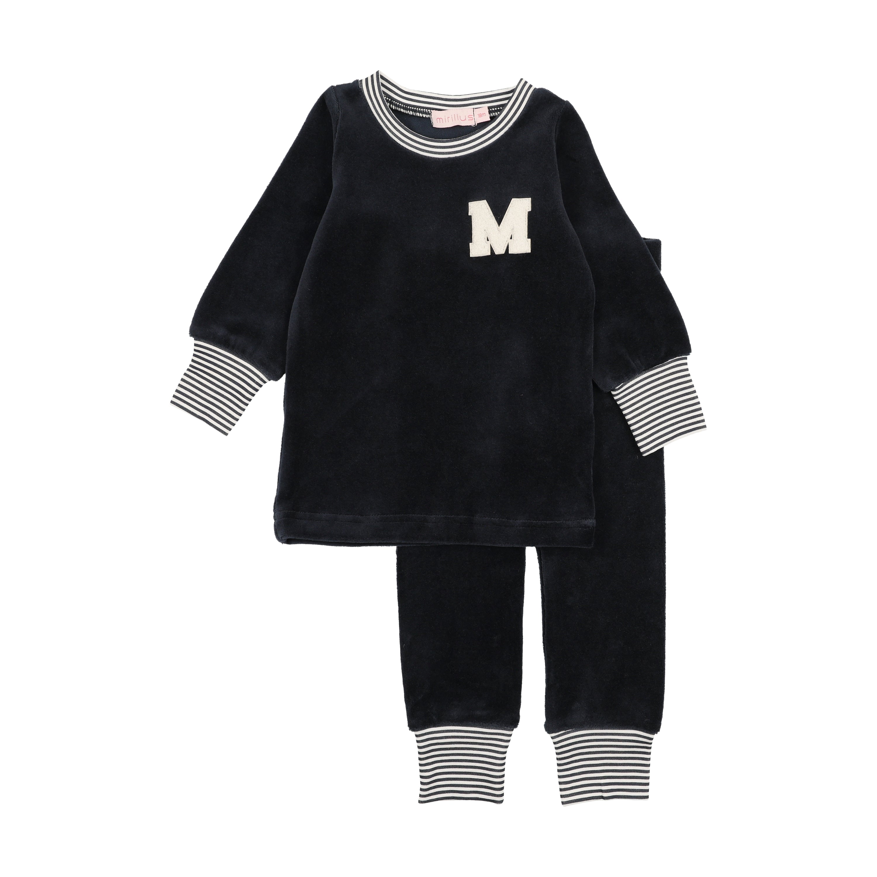 Cozy and playful, our Navy Velour Pajama with Striped Cuffs & Sherpa “M” is crafted from soft, stretched velour for a comfortable fit. It features navy and white striped cuffs on the hands and feet, matching striped neck ribbing, and a soft white Sherpa “M” for a signature touch. A playful mix of comfort and style for cozy nights.
