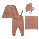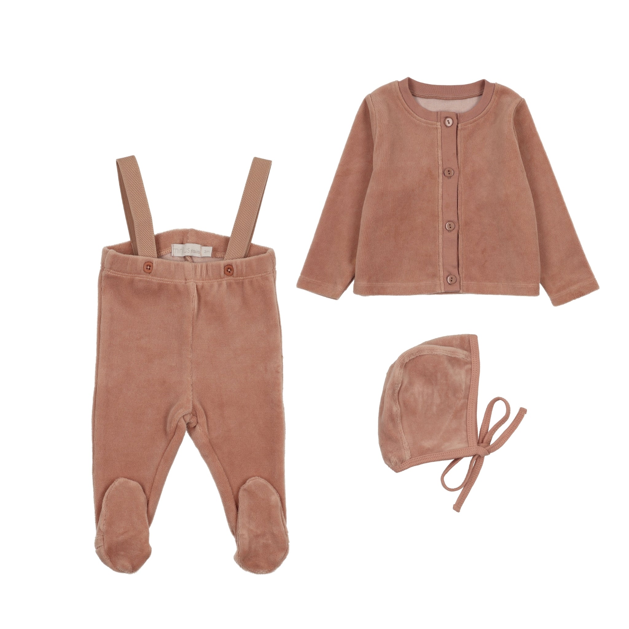 Wrap your little one in cozy elegance with our Mauve Velour Overall, crafted from soft stretched velour for comfort and style. Sizes 3M, 6M, and 9M feature footed bottoms for added warmth, while sizes 12M, 18M, 24M, and 3T come with open bottoms for easy movement. Complete the look with matching pieces from this collection, sold separately, for an effortlessly styled ensemble.